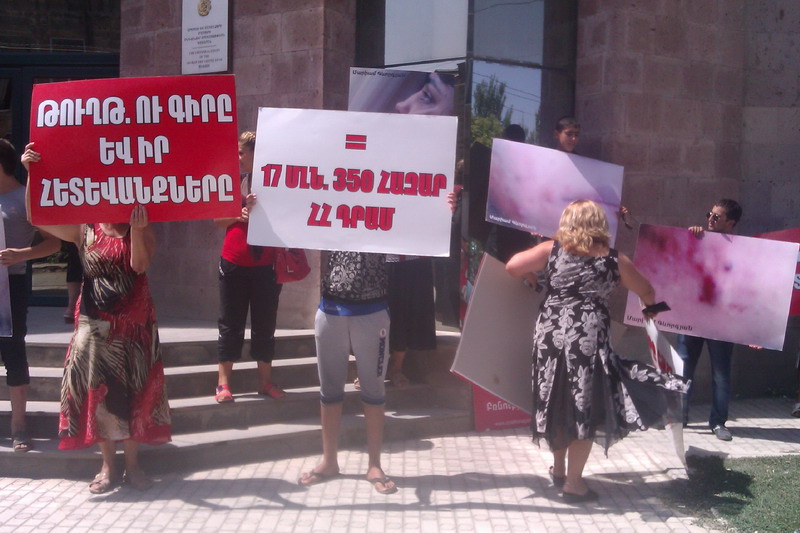 У здания суда находились родственники Мариам Геворкян и родственники свекрови- подсудимой. Молодые девушки «Коалиция против насилия в отношении женщин» в беседе с Aravot.am рассказали, что когда с плакатами только приближались к зданию суда, родственники обвиняемой стороны начали бросать в их адрес оскорбительные слова: «Назвали овцами, как только не обозвали, назвали даже бл…ми».