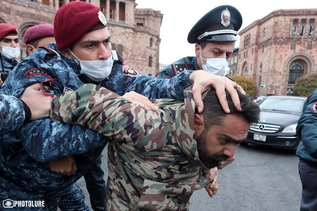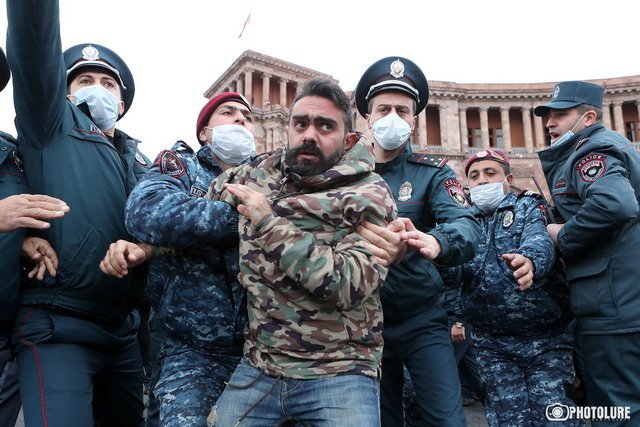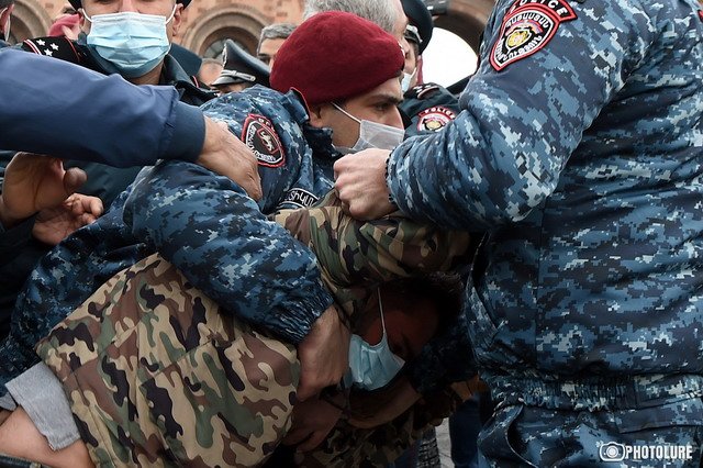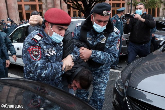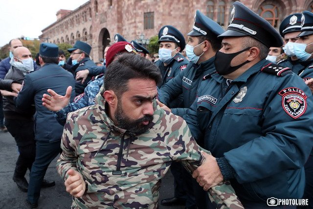 Произошла суматоха, сотрудники полиции вытолкнули Гегама Манукяна к барьерам. Тогда часть граждан перекрыла движение на Площади Республики, и полиция пытлась их вытолкнуть. Двух граждан красные береты насильно посадила служебные машины. «Мне нужна еще одна машина, джип», — сказал один из полицейских.