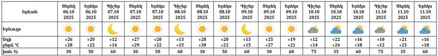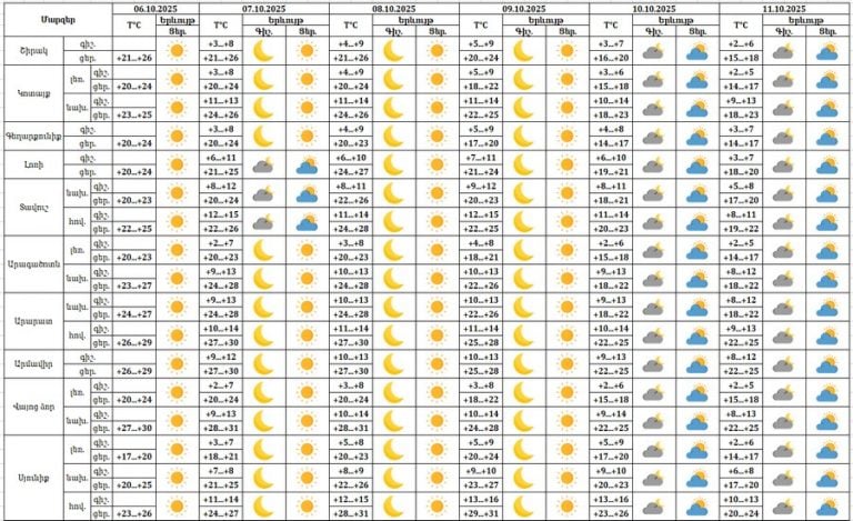В дневное время 6 октября и с 7 по 11 октября ожидается погода без осадков. Ветер — юго-западный со скоростью 2-5 м/с, с 8 по 10 октября в отдельных районах ожидается усиление ветра до 15-18 м/с.