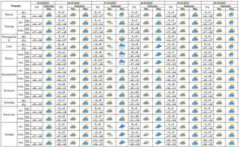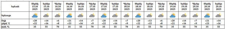 Днём 15 октября, 16-го, ночью 17-го, а также 18–19 октября и ночью 20-го ожидается погода без осадков. Днём 17-го и 20-го октября в отдельных районах возможны кратковременные дожди. Ветер юго-западный, 2–5 м/с. Температура воздуха днём 15 октября повысится на 2–4 градуса.