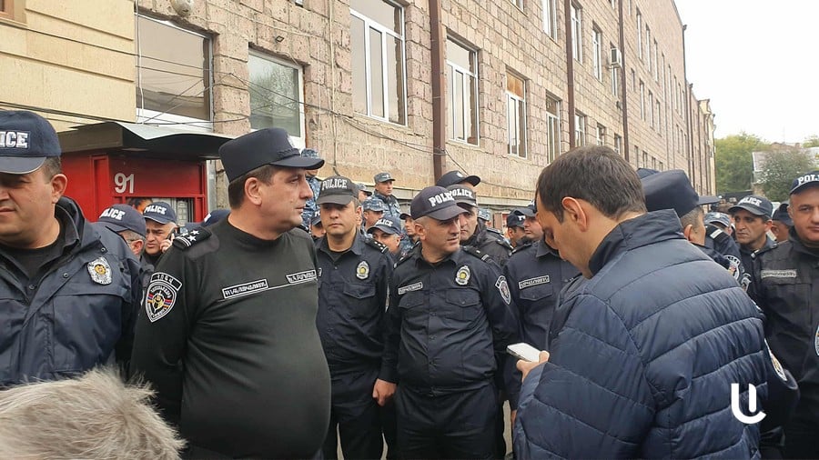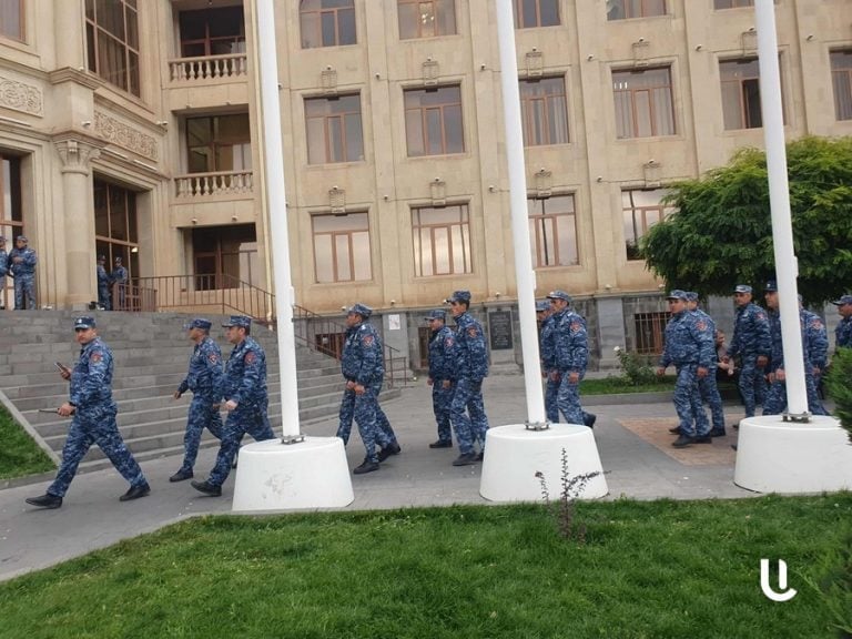 В Гюмри, сосредоточив большие полицейские силы и вытеснив граждан из главного входа мэрии, мэра Вардана Гукасяна задержали через задний вход, разбив стекло двери.