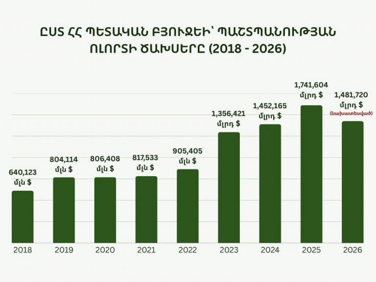 Расходы в сфере обороны (2018–2026 гг.) — в драмовом и долларовом выражении.