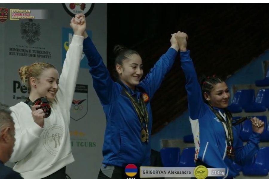 Первой из наших тяжелоатлеток выступила участница молодёжного первенства в весовой категории до 58 кг Александра Григорян, которая завоевала три золотые медали и стала чемпионкой.
