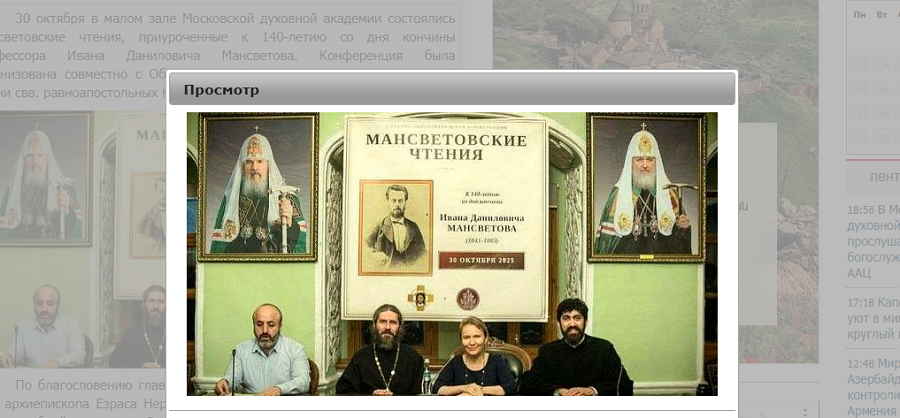 Еркрамас. 30 октября в малом зале Московской духовной академии состоялись Мансветовские чтения, приуроченные к 140-летию со дня кончины профессора Ивана Даниловича Мансветова. Конференция была организована совместно с Общецерковной аспирантурой и докторантурой имени свв. равноапостольных Кирилла и Мефодия.