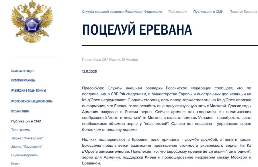 Армения из политических соображений хочет «отвязаться» от Москвы и оказать помощь Украине, приобретая часть зерна у Киева по более высоким ценам, с возмещением Еревану переплаты за счет средств Евросоюза, сообщили в пресс-бюро Службы внешней разведки (СВР) России. Об этом сообщает РИА Новости.