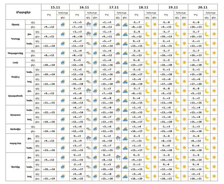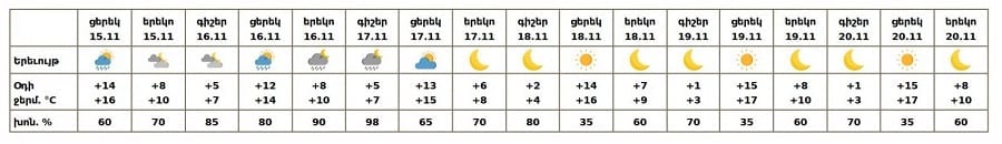 15 ноября днём, 16-го и ночью 17-го в отдельных районах ожидаются кратковременные осадки, ночью — в горных зонах в виде дождя со снегом.