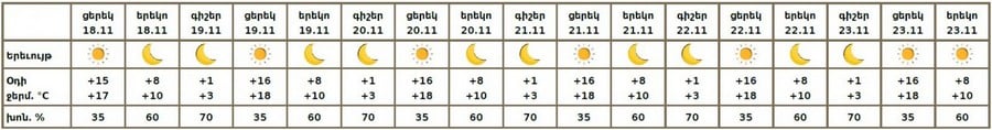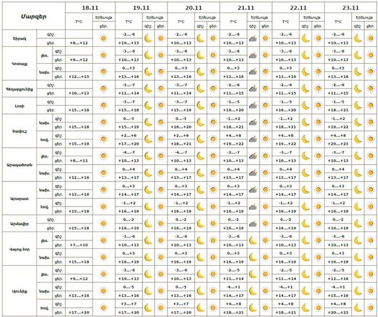 18 ноября днём и 19–23 ноября ожидается погода без осадков. На рассвете в Араратской долине ожидается кратковременный туман.