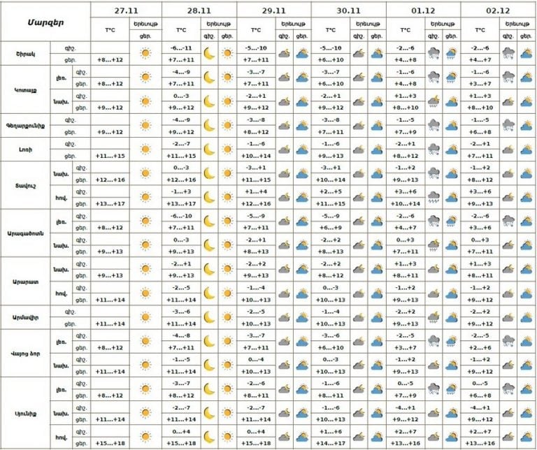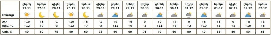 Днём 27 ноября, 28–30 ноября и днём 2 декабря ожидается погода без осадков, на рассвете в Араратской и Ширакской равнинах — кратковременный туман.