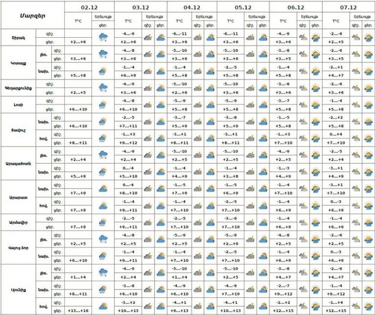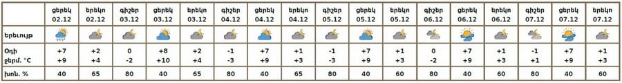Во второй половине дня 2 декабря в отдельных районах ожидаются слабые осадки: в горных районах — в виде мокрого снега, в предгорных и равнинных районах — в виде дождя.