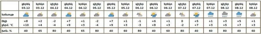 3 декабря днём, а также 4–6 декабря ожидается погода без осадков. В вечерние часы 7 декабря и 8 декабря ожидается дождь.