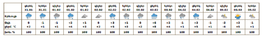 Днем 31 января, а также 1–4 февраля в отдельных районах ожидаются осадки: в предгорных и долинных районах — в виде мокрого снега, в горных районах — снега, в отдельных горных районах — метель и низкая горизонтальная видимость. 5 февраля ожидается погода без осадков.
