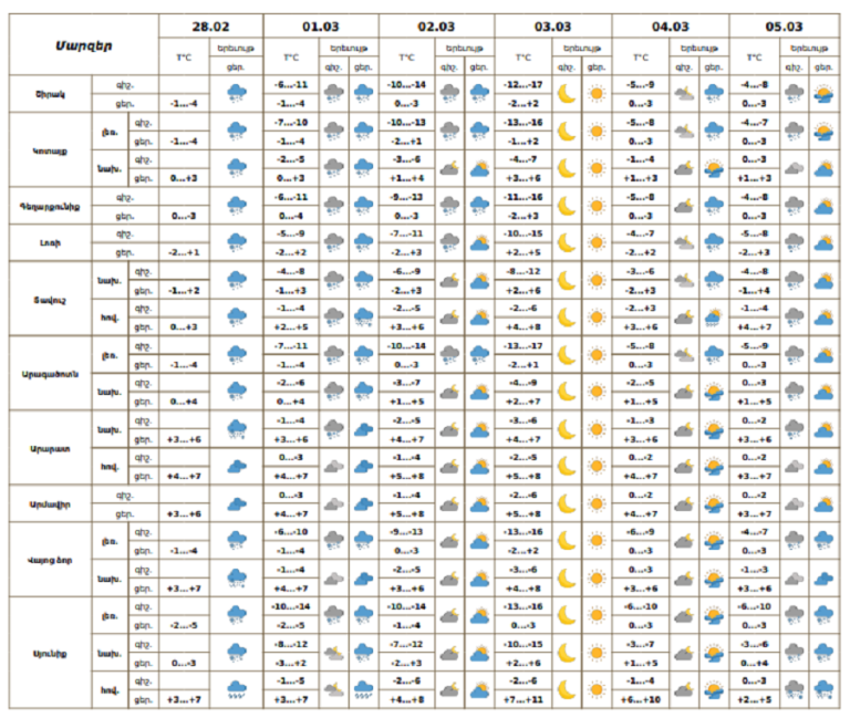 28 февраля днем, 1-2 марта, 4 марта днем, 5 марта в отдельных районах ожидаются осадки: в горных и предгорных районах в виде снега, в долинных районах — снега с дождем и дождя. В горных районах также ожидаются метель и низкая горизонтальная видимость.