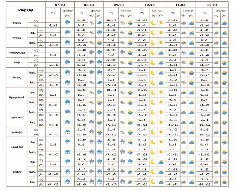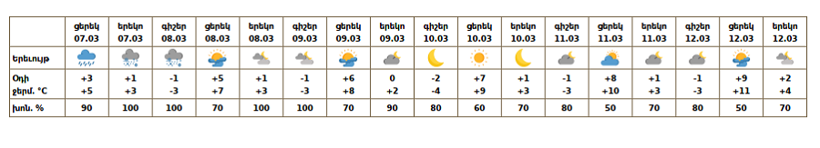 Днём 7 марта в значительной части регионов, 8–9 марта в отдельных регионах ожидаются осадки: в горных и предгорных районах — снег, в равнинных районах — дождь со снегом и дождь. В горных районах также ожидается туман, низкая горизонтальная видимость. С 10 по 12 марта прогнозируется погода без осадков.